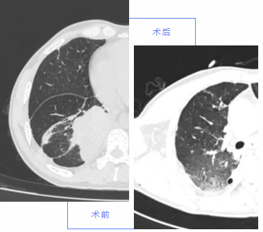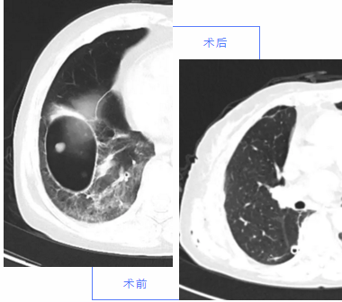 女性,68岁,反复咯血半年有余,近一个月来病情加重,前来我院胸外科就诊。胸部CT报告提示:1.右下肺含气液囊肿,考虑包虫病,建议临床进一步完善生化检查;2.右下肺间质性肺炎;3.右肺中叶纤维化病变。因患者慢性咯血,轻度贫血,上级医师查房后建议手术治疗,胸外科医师团队为其成功实施了胸腔镜下肺包虫切除术。术后患者病情平稳,目前恢复良好。