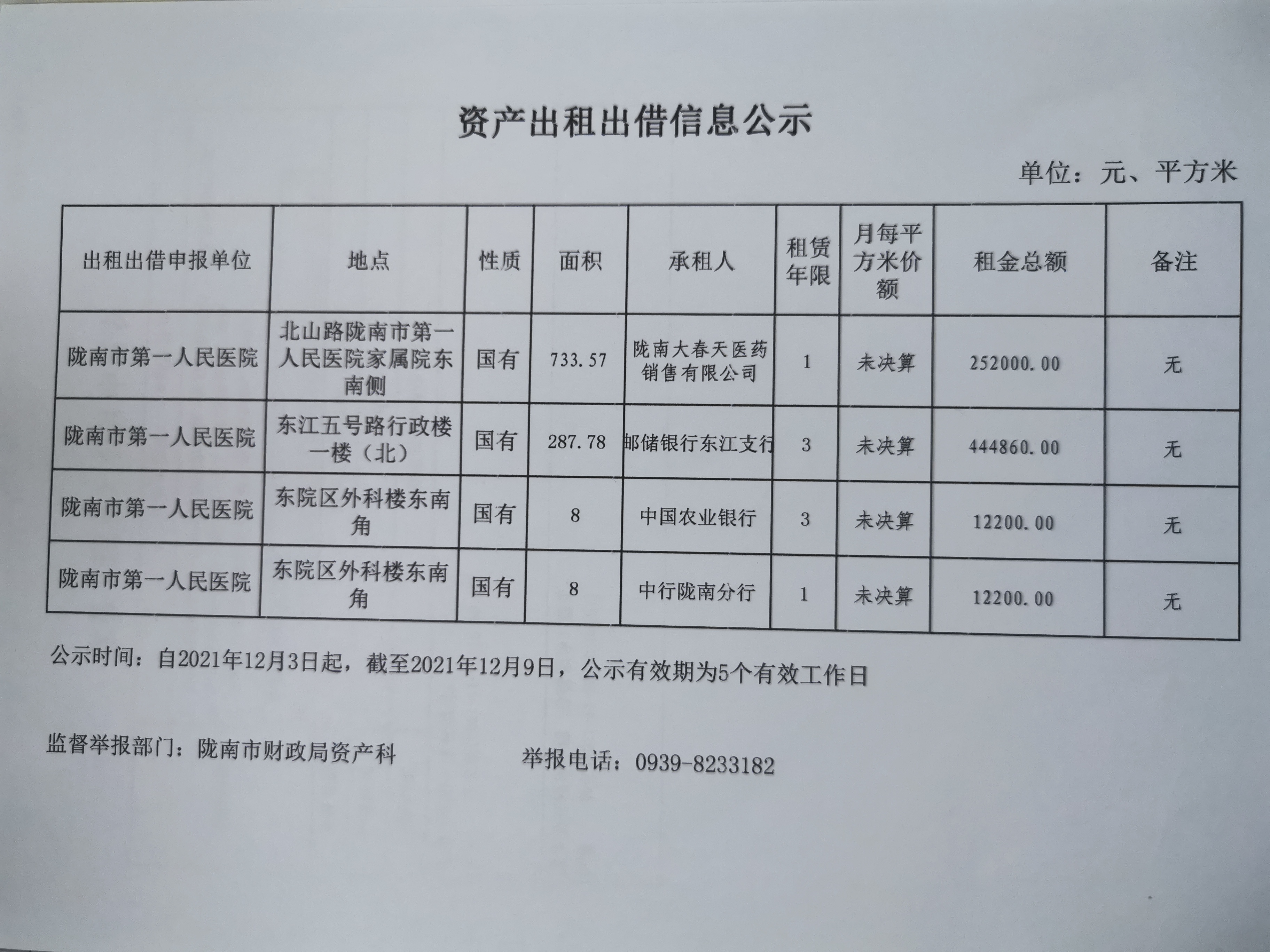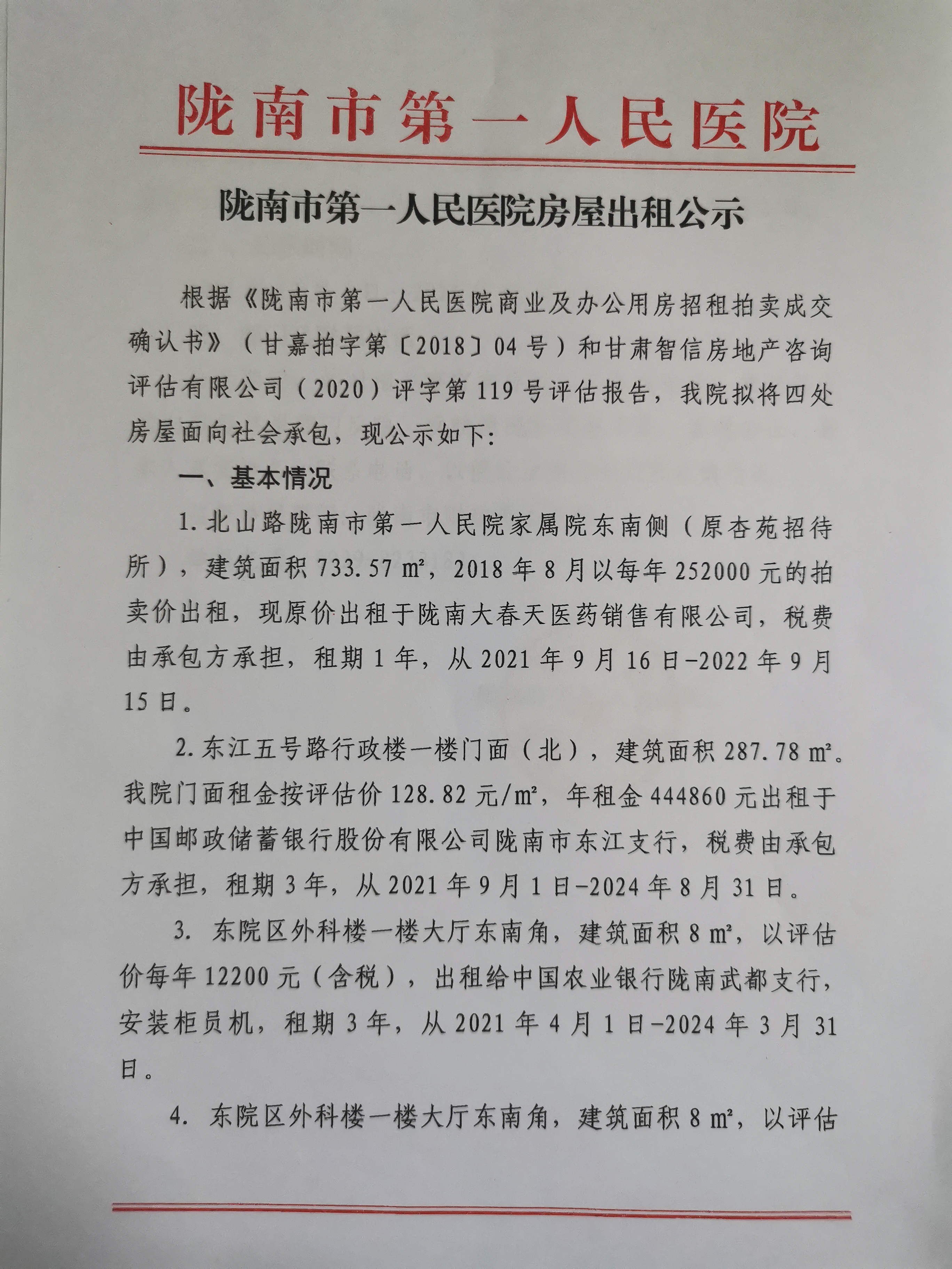 陇南市第一人民医院房屋出租公示