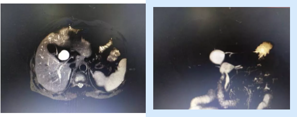 45岁男性患者上腹部反复疼痛10年余,曾因胆总管囊肿反复出现上腹部疼痛,在当地医院保守治疗4次,近期疼痛加重10天,且疼痛较上次剧烈急诊入住当地医院,由于患者病情复杂即转入我院。入住后经检查为胆囊结石、胆总管囊性扩张Todani分型为:Ⅳa型胆总管囊肿(肝内外胆管均有扩张)。