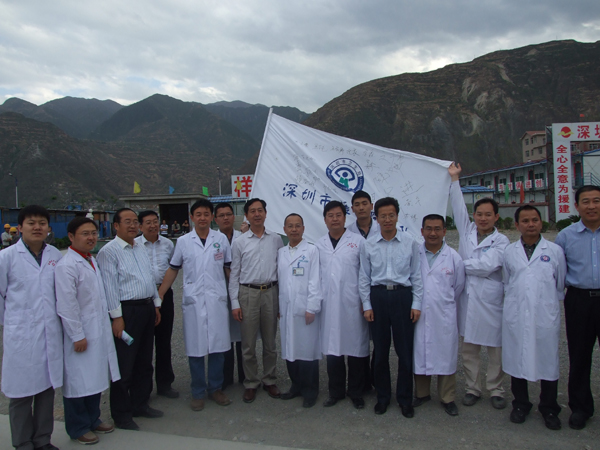 图为卫生部副部长陈晓宏、市委副书记、市长许文海和深圳援建全体工作人员的合影。