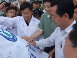 图中从左向右依次为:市卫生局副局长蔡玉成、市卫生局副局长苏俊明、市第一人民医院副院长杨文军、省卫生厅厅长刘维忠、市政府副市长杨秋红、卫生部副部长陈啸宏、市委副书记、市长许文海、省卫生厅副厅长李存文、市第一人民院长闫晓光、市卫生局副局长杨春、市第一人民副院长李成学