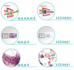 而近年液基薄层细胞学技术的出现,更是宫颈细胞学检测的一项革命。其采用专用宫颈细胞采样刷,深入宫颈口,刷取宫颈癌高发区域——移行区细胞,并将刷取细胞收集到装有化学固定液的保存瓶内,再经高速离心沉降式滤膜技术进行脱落细胞自动制片,再经过专用的细胞染色,经显微镜观察诊断,以宫颈细胞学沿用的诊断标准TBS图文系统显示诊断报告。这种方法避免了传统刮板难以刮取到宫颈管内膜细胞(移行区)的缺点、避免了硬质刮板对宫颈的损伤、避免了涂片薄厚不均的缺点,从而使细胞形态保存良好,细胞均匀、图像清晰、去除各种粘液杂质,明显提高阳性检出率,图像视野集中,减少诊断者工作疲劳,并可多次制片,剩余细胞可进行后期免疫组化、DNA检测等,大大提高了宫颈癌筛查的敏感性、准确率。