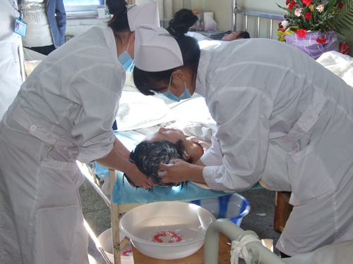 自开展优质护理服务以来,我院护理人员扎扎实实做好基础护理工作,他们的每一个微笑,每一句问候,都让病人感到无比的欣慰。有人说,护士是天使,在我院骨二科就有这样一些可亲可敬的天使,每天带着天使般的微笑穿梭于各个病房,以爱心和责任心抚慰患者。您瞧,责任护士李亚岚和李花正在为11床患者段亚军洗头呢,他们边洗边问:“段亚军,水温合适吗?”段亚军说:“合适合适,你们能为我洗头,我非常感谢!"市医院的护士真好,给我们打开水,还为我们洗头、洗脚、剪指甲,她们想得可真周到啊!