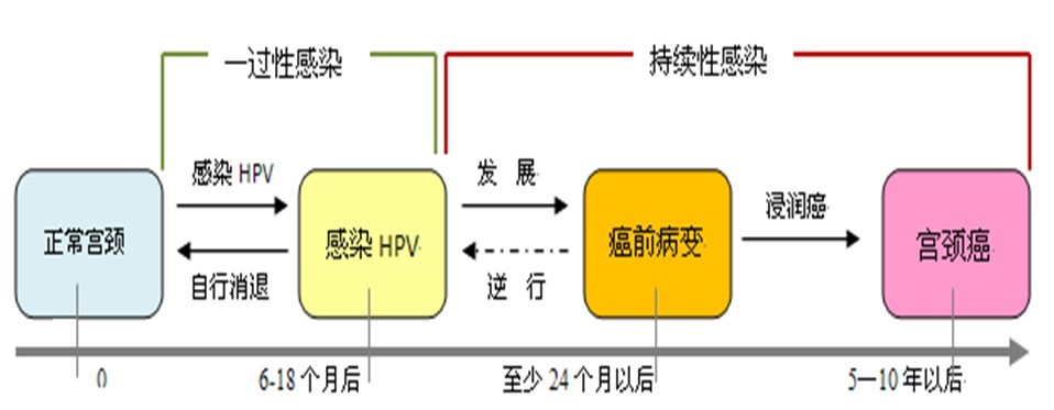 最新研究表明,宫颈癌与人类乳头状瘤病毒(HPV)关系密切,生殖器人乳头瘤病毒(HPV)感染是宫颈癌的直接病因,持续性高危型HPV感染可以导至宫颈癌,96%~100%的宫颈癌前期病变及宫颈癌中都能发现高危型HPV感染。由于宫颈癌存在较长的、可逆转的癌前病变期,正常的宫颈受到高危型HPV病毒持续性感染之后才会发生病变,从癌前病变发展成癌要经过3-10年时间(见下图),这就为早期筛查、干预和治疗提供了足够的时间。 早期发现及时治疗后,宫颈癌患者五年治愈率可达90%,宫颈癌是目前唯一病因明确、可以早期预防和治疗、唯一可以消灭的癌症。因此,宫颈癌的早期筛查和预防就有着重要的意义。