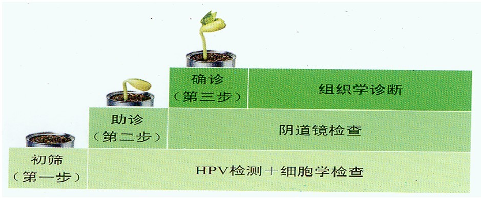 国内广泛推行宫颈病变三阶梯诊断:HPV-DNA检测+液基细胞病理学涂片、阴道镜检查、病理组织学活检(如图):