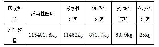 2023年我院共产生医疗废物为125849.2kg。其中感染性医疗废物、损伤性医疗废物由陇南市武都区康盛垃圾处理厂转运收集处置。病理性废物、药物性废物、化学性废物达转运量后,由甘肃金创绿丰环境技术有限公司收集处置。