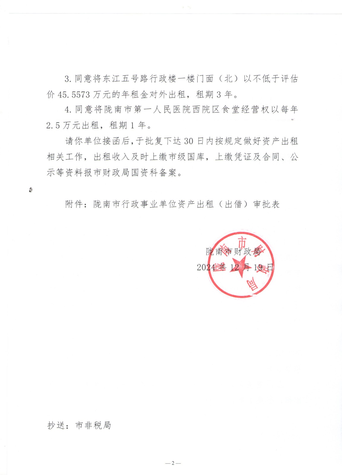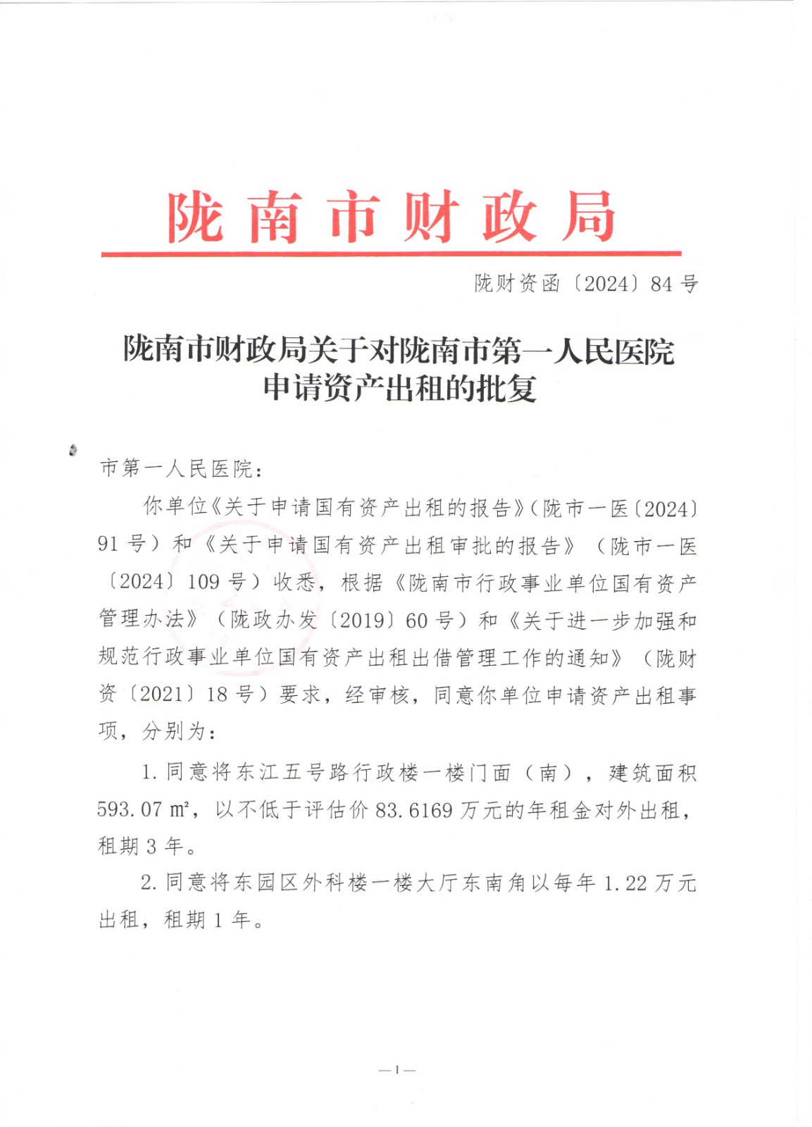 关于对陇南市第一人民医院申请资产出租的公示