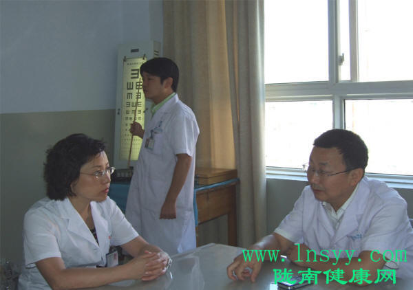 院长闫晓光(右一)向阳光医院院长王玲(左一)了解白内障患者术后恢复情况