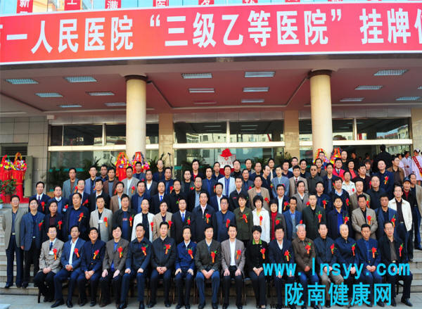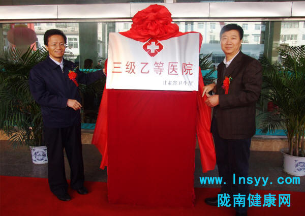 2009年11月9日,我院三级乙等医院挂牌庆典仪式在院隆重举行。市委书记、市人大常委会主任王玺玉,市委副书记、代市长许文海,甘肃省卫生厅副厅长常继乐,市委副书记、市纪委书记李学春,市委常委、宣传部部长张昉,市委常委、副市长、深圳援建陇南前方指挥部总指挥张文,市委常委、区委书记李旺泽,市人大常委会党组副书记任跃章,市政协副主席骆国栋、张金生、张全新等省市领导,以及市、县区有关单位和部门的领导、全省各级医院和医疗单位的专家,出席了庆典仪式。副市长何兴林主持了仪式。陇南市委办公室、市政府办公室,深圳市人民医院,甘肃省人民医院、甘肃省妇幼保健院、甘肃省中医院等12家单位发来贺电 。院长闫晓光在仪式上汇报了我院创建三级乙等医院情况,院党委副书记李高峰宣读了贺电。