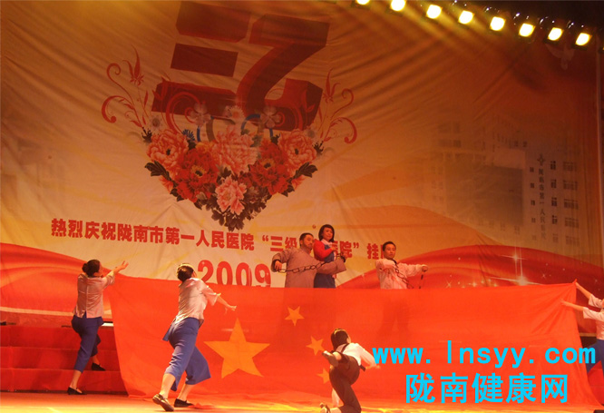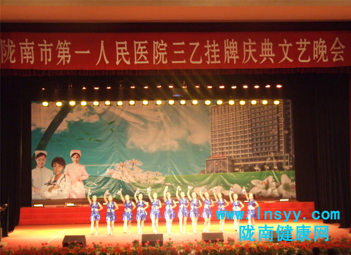 为隆重庆祝我院三级乙等医院挂牌,于11月9日晚八时,我院“三级乙等医院挂牌庆典”文艺晚会在陇南礼堂欢快的乐曲声中拉开帷幕。市委副书记、代市长许文海,市委常委、宣传部部长张昉,副市长何兴林,市人大常委会党组副书记任跃章,市政协副主席张全新,市卫生局副局长蔡玉成等市局相关领导,及全院职工观看了文艺演出。晚会在热烈喜庆的歌舞“欢聚一堂”中拉开了帷幕。音乐快板“医院的明天更辉煌”,道出了医院的发展历程,说出了广大医务人员的心声。舞蹈“天使颂”、“轻舞飞扬”更是赢得掌声不断……