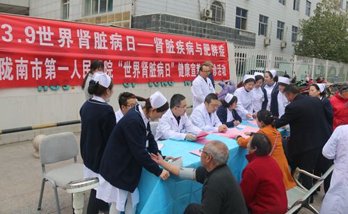 3月9日,在第12个“世界肾脏病日”,肾病科组织医务人员在陇南市第一人民医院西院区门口开展了主题为“肾脏疾病与肥胖症”的健康义诊活动。活动中,刘永峰主任、曹为副主任为市民详细答疑解惑,指导市民从转变生活方式、饮食结构、合理用药等方面对肾脏病和肥胖症进行有效的预防,纠正了很多患者关于肾脏病与肥胖症认识方面的误区。刚刚咨询结束的老人李某某伸出大拇指说:“通过市医院专家的介绍,晓得了许多健康生活的常识,收获很大,希望医院常为市民举办这一类型的宣传义诊活动,大夫们,好样的!”。