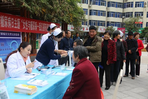 为宣传贯彻党的十九大精神,做好2017年糖尿病日宣传活动,提升社会各界对糖尿病的重视,11月10日,我院组织内分泌科专家在武都区盘旋路街心花园举行了“联合国糖尿病日暨蓝光行动”大型义诊活动,本次活动围绕2017年联合国糖尿病日主题“女性与糖尿病-我们拥有健康未来的权利”开展了一系列糖尿病的防治教育和宣传。
