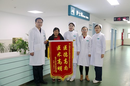 近日,在我院乳腺科,一位患者赵某的家属把一面写着“医术高明、医德高尚”的鲜红锦旗郑重地交到医护人员的手里,并激动地握住他们的手连声道谢:“真的非常感谢你们,是你们精湛的医术治好了我亲人的病,你们医护人员像家人一样关爱着她,使她在治疗的过程中毫无畏惧!”。“这是我们医护人员的职责,是我们应该做的事情,不用客气的!”医护人员腼腆的说道。这是怎么回事呢?